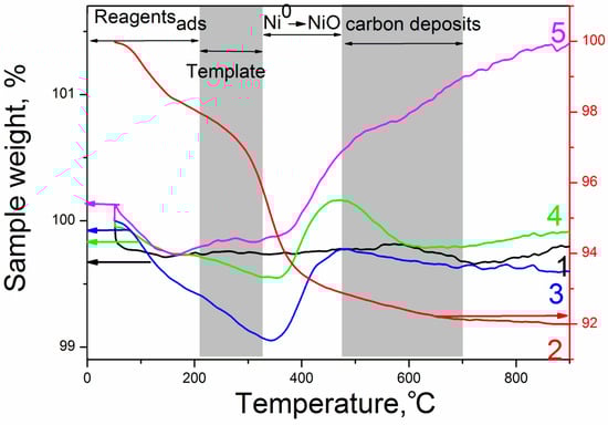 TGA profiles for the catalysts after the CSMR reaction at 750 °C. 1—Ni/CeMg-C-S-O; 2—Ni/CeMg-A-S-V; 3—Ni/CeMg-A-S-O; 4—Ni-Pd/CeMg-A-S-V; 5—Ni/CeMg-A-P-O.