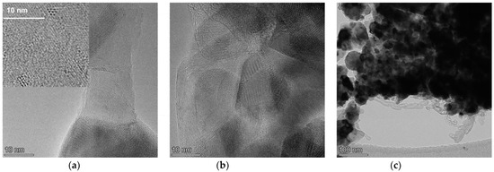 Carbon deposits were found on the surface of low-dispersed nickel metal particles. No carbon deposits were found on Ni clusters in the MgO site and/or on NiPd nanoparticles (Figure 10). Ni particles formed as a result of such a reductive partial extraction of Ni2+ ions in a solid solution will have a fairly strong interaction with the NiO-MgO support and a strength in sintering resistance and coke generation [37,68]. The size of nickel crystallites impacted the quantity and nature of carbon deposition. A higher metal–support interface prevents the carbon formation or promotes the combustion of carbon from the catalyst surface due to an increased oxygen migration from the substrate to the metal surface [67]. Moreover, alloying Ni with noble metals or the very close location of the noble metal to the active Ni species is an effective way to increase catalytic stability due to breaking the C-H bond in such a way that carbon deposition is reduced [69]. From these images, it can be concluded that the highly dispersed NiPd particles and the Ni clusters in MgO provided a high resistance of the catalyst to sintering and the forming of carbon. Even if the particles were covered by carbon, the stability and activity of this catalyst were excellent, indicating that highly dispersed Ni and NiPd particles were responsible for the catalytic performance. It would be expected that catalysts with a lower nickel content would be efficient for the reaction. Note that doping with Mg improved their thermostability at sintering and magnified the Ni–support interaction. On the other hand, the tolerance to carbon deposits was enhanced for CeO2-based catalysts without doping, compared to Ce0.2Mg0.7Ni0.1O1.2, which can be associated with a decrease in the oxygen mobility at a higher concentration of dopant [28]. Experiments concerning CeO2-MgO with an optimal amount of Mg are in progress to develop more effective catalysts.
