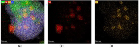 The HRTEM data confirmed the results of the XRD and TA. For spent Ni-Pd/CeMg-A-S-V, the sample contained two types of active component: 15–25 nm in size and clusters consisting of several atoms (Figure 9). HAADF-STEM with an EDX analysis showed (Figure 10) that the CeO2 and MgO regions were present in the samples. These inhomogeneities were due to the complete destruction of the solid solution. Analogous results have been reported by Matus et al. [28], who prepared a (CeMg)1−xNixOy catalyst (Ce/MgO = 0.25 – 1) by a polymerized complex method. The combination of the HAADF-STEM images and the STEM–EDX results allowed the identification of the active component phase. Three various kinds of active phase could be clearly identified: low-dispersed particles with a size of 15–25 nm, which corresponded to metallic Ni; then, the second type of bimetallic NiPd nanoparticles with a size of <10 nm (Figure 11); and finally, clusters located in the structure of MgO indicating the formation of a Ni-Mg-O solution (Figure 9) after the calcination step. Pd doping affects metal dispersion at two stages of the catalyst synthesis. Firstly, Pd acted as a nucleus for the reduction and growth of Ni particles in the polyol method. The three phases were identified in the XRD pattern for Ni0.97Pd0.03 colloid calcined at 300 °C in vacuum at 10 mbar: an unidentified phase with interplanar spacings of 7.96, 4.07, and 2.61 with an average CSR size of 1.5 nm, the Ni3C phase (PDF #04-0853) with a particle size of 14 to 17 nm, and a NiPd alloy (ICSD, CC = 670, 625) with an alloy particle size of 4 nm (Figure S9). Secondly, Pd stabilized the surface structure of active ensembles during the reduction treatment and the CSMR process. Note that the monometallic catalyst prepared from the nickel colloid showed an unexpectedly low activity and stability.