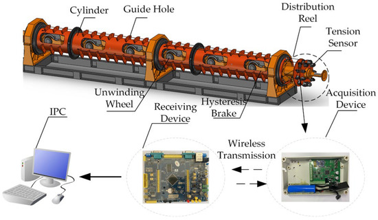 The experimental setup mainly consists of the unwinding wheel, winding wheel, braking system, guide rail sliding block mechanism, sliding friction platform, PLC, tension sensor, and upper computer as shown in Figure 6. The braking system is used to provide the strand tension T i at the end of the cylinder, and the sliding friction platform applies friction force to the strand. The guide rail sliding block is used to change the direction of the centrifugal force on the strand during the twisting process. The tension sensor senses the change of the strand tension in real time through the PLC, and the PLC-Recorder converts and stores the strand tension data in real time.