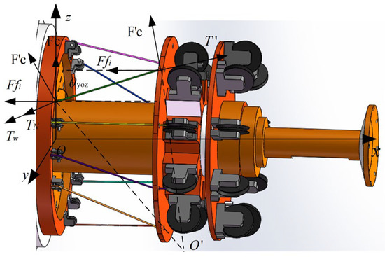 The movement of the strand between the cylinder bodies is a complex and multi-span composite motion, making it difficult to model and analyze the strand over the entire span range. At the same time, different strands follow different paths during the twisting process, and they pass through a different number of guide holes. Therefore, it is a prerequisite and basic for the strand in the overall feeding process to analyze the force between the strand and guide hole under a single span. The arrow of w stands for center axis rotation, as shown in Figure 2. The figure was drawn in the visio.