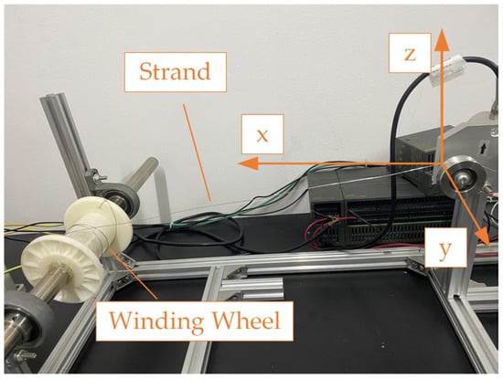 To simulate different twisting paths of each strand at the distribution reel, the relative position between the winding wheel and the sensor was changed in the experimental setup. As shown in Figure 7, a three-dimensional co-ordinate system was established at tension sensor, and the distance between the wheel and the sensor was changed. Simulated experiments were carried out for each of the eight strands at speeds of 200 r/min and 300 r/min. The initial brake tension T 0 was set to 2 N, and the initial test conditions are shown in Table 3.