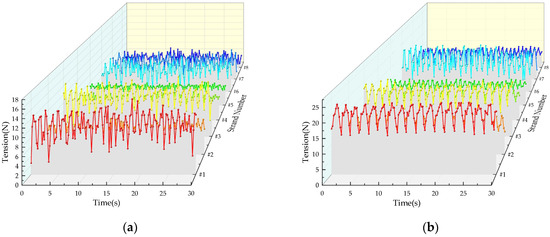 Figure 8. (a) 200 r/min tension data of each strand; and (b) 300 r/min tension data of each strand.