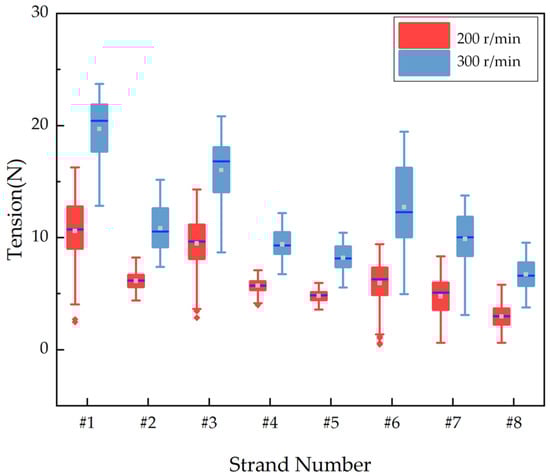 The range of tension fluctuation of each strand at 200 r/min and 300 r/min is presented in box plots in Figure 9. As the speed increased, the range of the tension fluctuation and the average tension of each strand increased. For the same speed, when the strand had a significant deviation at the distribution reel, the average tension increased, indicating an increase in the overall force on the strand. When the deviation of the strand at the distribution reel was small, the range of the tension fluctuation obviously decreased. It is evident that the change of the strand twisting-deviation path affects the range of the tension fluctuation.