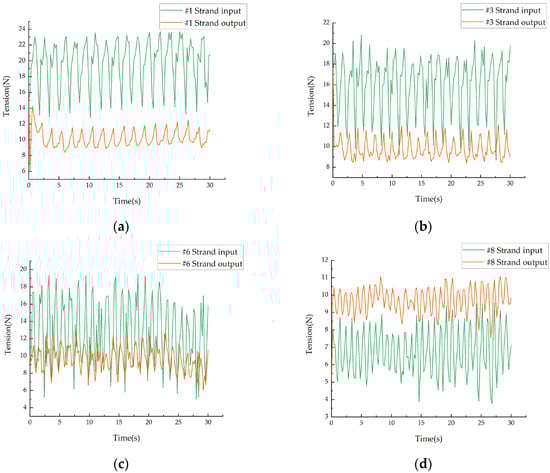 When the simulated forces were applied to each strand, the strand tensions showed a certain fluctuation, as shown in Figure 8. The colored lines represent strands with different numbers, corresponding to strand number axes in the figure. When the rotational speed was the same and the strand did not have an obvious deflection at the distribution reel (#2, #4, and #5), the tension of the strand closer to the twisting end was small, and the strand farther away from the twisting end was larger. The average strand tension was positively correlated with the span of the guide holes. The more guide holes the strand passed through, the larger the average tension.