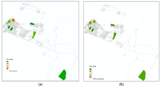 - Drop in flow: Flow in the WDN is another operational parameter directly related to leakage. Flow drops and leakages are interrelated and can both have negative impacts on the performance of WDN. If there is a significant leak in the system, it can reduce the pressure and flow rate downstream of the leak. This can result in a loss of performance or efficiency in the system, as well as potential safety hazards. Flow is usually used to assess the amount of leakage using the mass balance [40].