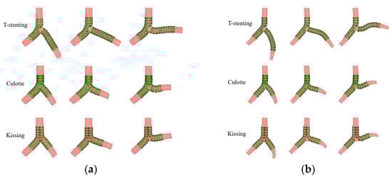 The models of post-stenting. The three stenting techniques models of the T-stenting, Culotte, and Kissing were selected in the bifurcation angles with 80°, 113°, and 142° from left to right in the artery A and the artery B; (a) Type of artery A; (b) Type of artery B.