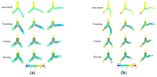 The results of blood flow velocity. The velocity distributions with non-stent, T-stenting, Culotte, and Kissing techniques were displayed for whole models of the artery A and artery B; (a) Type of artery A; (b) Type of artery B.