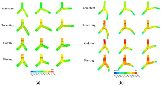 The results of the artery wall pressure. The distribution of the wall pressure comparing non-stent, T-stenting, Culotte, and Kissing techniques in the arteries A and B; (a) Type of artery A; (b) Type of artery B.