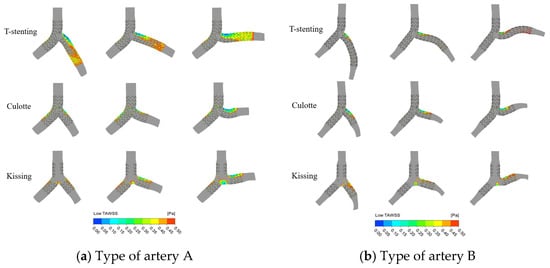 The distribution of the specific low TAWSS in the artery A was wider than the artery B, and the area of the specific low TAWSS seemed to be increased with the bifurcation degree. According to the outcomes of the specific low TAWSS, it was shown that the T-stenting of the artery A could provide the worst presentation with a large bifurcation angle, but the best performance was the Kissing technique. The specific low TAWSS of the artery B displayed that there was no obvious difference in the performance of the specific low TAWSS between the T-stenting and Culotte techniques. The kissing technique was easier to cause the specific low TAWSS than the other two techniques in the artery B.