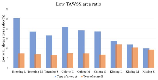 Low TAWSS area ratio. Comparisons of the low TAWSS area ratio were performed in the T-stenting, Culotte, and Kissing techniques of the arteries A and B. (TAWSS: time-averaged wall shear stress).