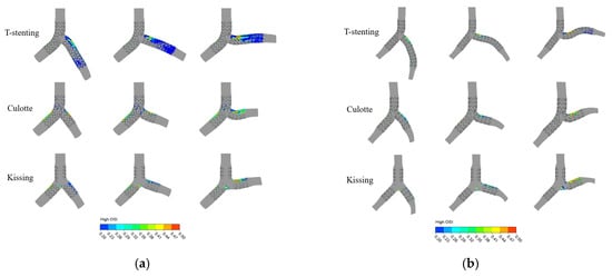 In addition, the index of the artery wall pressure was also considered an important role to investigate the stenting restenosis with three types of stenting techniques in the different arteries. Thubrikar et al. [45] indicated that the arterial wall pressure and accompanying stretch is one of the contributing factors to the atherosclerotic lesions. Excessive wall pressure will cause atherosclerotic plaques and the plaques to rupture [46]. In the wall pressure distribution, results showed that the three stenting techniques caused the wall pressure to significantly increase in the two arteries. In the three stenting techniques, the wall pressure of the artery B with the Kissing stenting technique had the most significant increase than the other models.