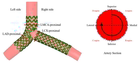 The result of the arterial branches revealed that the OSI of the LCX was maxed among three branches, and then when located at the LMCA, the LAD showed minimally in the arteries A and B. Both Culotte and Kissing techniques in the stenting structures around the bifurcation area were more complex than the T-stenting. Moreover, the usage of double stents in a deformed structure could interfere with the blood flow velocity and disturbance, resulting in the OSI increasing and a high risk of restenosis. Furthermore, according to the OSI distribution of the arterial branches, the high OSI was mainly concentrated at the regions C and D, which was located at the lateral side of the LCX arterial wall. Importantly, the distribution tendency of the OSI was consistent with the blood flow in the LCX branch.