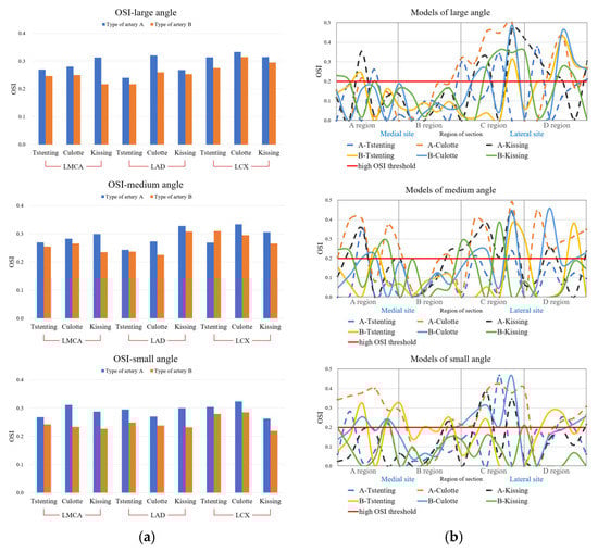 (a) Comparisons of a high OSI with the three angles comparing the three stenting techniques in the arteries A and B; (b) Comparisons of the OSI on the LCX branch in different regions of the artery section near the bifurcation structure. (OSI: oscillatory shear index; LCX: left circumflex artery; LMCA: left main coronary artery; LAD: left anterior descending artery).