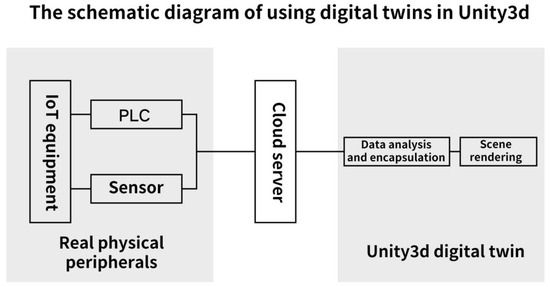 Unity3D was originally proposed as a 3D game development tool. With the development of the industrial IoT, it has been widely used in multiple digital twin simulation fields. It can not only render 3D simulation models in real time but also display received sensor data or cloud platform data synchronously. With this tool, staff can grasp actual usage status information for external IoT equipment on time and can use multiple platforms such as AR/VR/MR for human–computer interaction to realize remote and safe control of machinery and equipment [21].