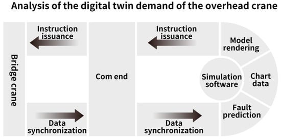 Digital twin technology is used to map the real world to the virtual world through perception and calculation to realize virtual–real fusion and cognitive prediction. It is an important approach to realize “simulation” [1]. Application of digital twin technology to predictive maintenance of overhead cranes requires building an accurate model of an overhead crane and monitoring and tracking it. The working status of each component of the overhead crane can be fully grasped through formulating corresponding standards. This method can detect the operating status of the overhead crane and predict the service life of the main components, so it is significant for the normal operation and safety precautions of overhead cranes [2]. Digital twin simulation is to keep in sync with its reflected data of the overhead crane in terms of appearance, content, and movement speed, and the state will be the same [3]. Though the simulated crane is a virtual 3D software product, it can truly represent the performance of the physical body. In actual experimental operations, it can remotely monitor the running status of a crane from a safe distance and issue work instructions such as start, stop, forward, and backward. Traditionally, the operating experience of machinery and equipment is vague, difficult to grasp, and indispensable for judgment [4]. In contrast, application of simulation digital twin technology can digitally manage experience that could not be saved before, as well as save, modify, copy, and migrate the experience [5]. Based on currently achieved program simulation, the thinking imagination can be further broadened. Meanwhile, a complete database of crane operating parameters can be established through repeated experiments to achieve data collection, storage, and analysis. In addition, through using new-generation technologies such as artificial intelligence, big data, and edge computing, all the states in each step of the overhead crane can be predicted, and evaluation and warnings of its potential risks can be made in advance [6].