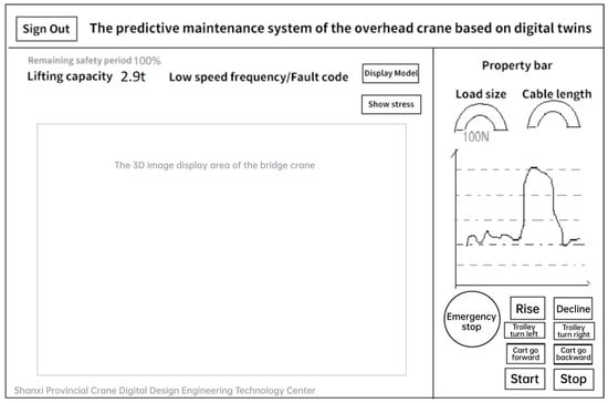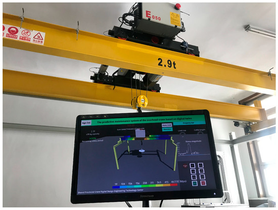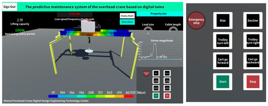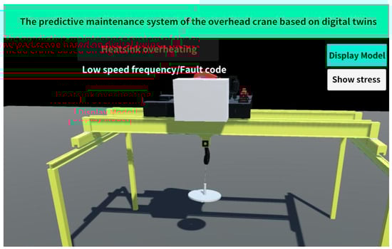 The predictive maintenance system of the overhead crane based on digital twins could display the operation status of the crane in real time and display the status of the main girder, e.g., the finite element analysis result and the fault code, as shown in Figure 14.