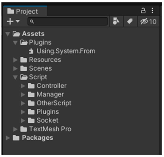 Folders, such as “Scenes”, “Resources”, and “Script”, were created to store different functional modules. The created directory structure is presented in Figure 4.