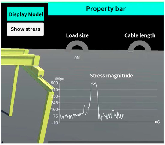 Meanwhile, the digital twin program rendered corresponding color changes according to the actual movement instructions of the crane. The instrument panel on the right side of the simulation software highlighted the weight of the crane cargo and the length of the cable in real time. The true stress value at each time point was recorded on a linear graph, and the linear image had an almost consistent variation trend with the observed stress value of the overhead crane.
