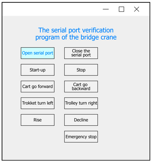 In the serial communication of the overhead-crane project, the com terminal was plugged into the microcomputer system to forward and verify the cyclic redundancy code CRC16. During this experiment, eight instructions needed to be issued to the crane, including front, back, left, right, rise, decline, start, and stop. The work instructions of the overhead crane were generally composed of eight bytes. For a specific instruction, CRC16 calculation was first conducted through a software program to obtain a two-byte check code. Then, the eight bytes of the original instruction and the two-byte check code were spliced into a new data stream of ten bytes, which were sent to the Com terminal through serial communication. After the Com terminal confirmed the verification, the corresponding work instruction was finally sent to the overhead crane.