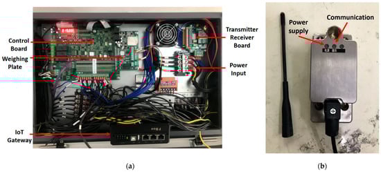 The IoT gateway communication settings. (a) The location of the IoT gateway box in the bridge-crane distribution box. (b) The com terminal transmitter.