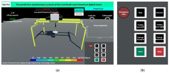 - A good human–computer interaction interface is provided, making it easy for the operator to give control instructions to the digital twin model and obtain the bridge crane’s real-time operational data.