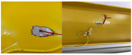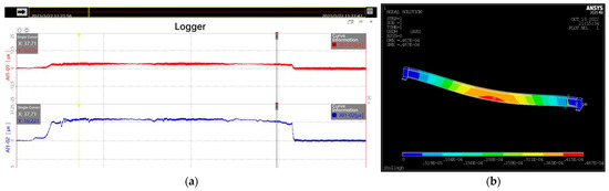 The fatigue failure of the main beam of the overhead crane was the most important form of failure. Thus, the life prediction for the overhead-crane components was mainly the fatigue-life prediction for the main beam. The stress–strain gauges were arranged separately for the main beam of the bridge crane in the middle position, as shown in Figure 12. The collected stress data was transmitted back to the digital twin system through the IoT gateway for analysis. The collected stress changed with time, and the digital twin interface was controlled to make the crane hook move up and down. The stress changes are shown in Figure 13a. The collected data were subjected to finite element analysis, and the analysis results are shown in Figure 13b.