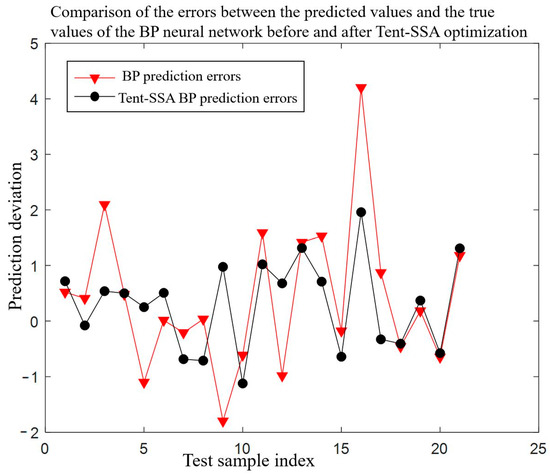 Through experiments and simulations, 145 data sets related to stress and crane life were obtained. Based on these 145 data sets, a BP neural network prediction model was established in a supervised learning mode, i.e., the establishment of the model was completed via dividing the data sets into training sets and test sets. Through multiple experiments, in the 145 data sets, when the ratio of the training sets to the test sets was 25:4 (125 training sets and 20 test sets), the training performance was the best. The error comparison of the prediction data before and after optimization, executed through verification with the test sets, is shown in Figure 15.