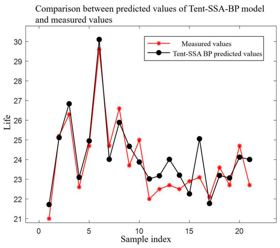 Figure 16 is a schematic diagram of the comparison between the predicted life values and the measured values of the 20 test sets. As shown in Figure 16, the predicted life values were close to the measured ones, and there were small errors between them. Thus, this prediction model had a better prediction effect.