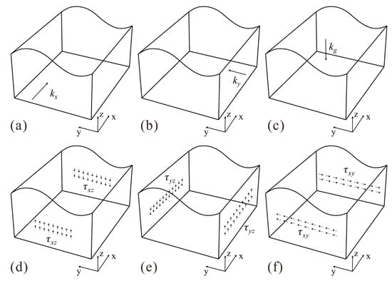Different boundary conditions. (a) horizontal stress in the X-direction; (b) horizontal stress in the Y-direction; (c) gravity stress; (d) shear stress in the XZ-plane; (e) shear stress in the YZ-plane; and (f) shear stress in the XY-plane.
