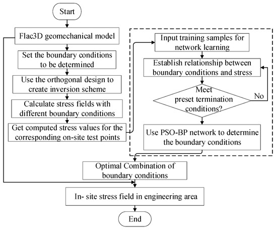 To enhance the accuracy of in situ stress inversion results, a nonlinear numerical analysis approach was proposed that combines the model boundary conditions with the PSO-BP algorithm. In this method, the complex geological movements are resolved into six basic boundary conditions, and then, through FLAC3D software, the stress state of each boundary is calculated to form the network samples. The PSO-BP neural network is used to establish a nonlinear relationship between the boundary conditions and the stress state at specific testing locations. Finally, the optimal boundary conditions that coincide with the measurement results are obtained through iterative searching. The primary implementation steps are shown in Figure 2: