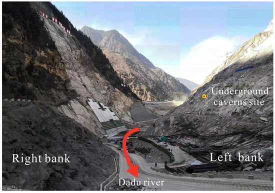 The Shuangjiangkou hydropower station in Jinchuan County, Sichuan Province, is the fifth power station in the Dadu River basin. Figure 3 shows the site of the Shuangjiangkou hydropower station, which has the highest dam in the world. The underground cavern is deeply buried on the left bank with a horizontal depth of 300–500 m and a vertical depth of 42 m, and its axial azimuth is N10°W. F1 is the main fault distributed around the underground cavern area, which has a width of 0.5 to 0.6 m, and the occurrence is about N79°W/SW∠48°. A lamprophyre also occurred about N35°–50°W/SW∠72°–75° at the cavern area, with a width of 0.8–1 m. In general, the Shuangjiangkou underground cavern area mainly comprises porphyritic granite with different degrees of weathering. Currently, empirical systems, such as rock-mass rating (RMR), tunneling quality index (Q) system, and geological strength index (GSI), are mainly utilized in international rock engineering projects [28,29,30]. In the geological survey report of Shuangjiangkou Hydropower Station, the (basic quality index of rock mass) BQ method [31] is employed to classify the rock mass into four types of materials, namely, class II (fresh granite), class III (moderately weathered granite), class IV (strongly weathered granite), and class V (geological structures), as listed in Table 2.