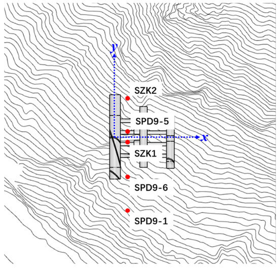 In situ stress measurements are a direct method for identifying the magnitude, direction, and distribution of in situ stress in the engineering field. Figure 4 displays the layout of in situ stress measurement points around the underground caverns on the left bank. The five measurement points are situated parallel to the main powerhouse’s axis and located inside the SPD9# structure at an elevation of 2268 m. The measured data is obtained in the geodetic coordinate system, and thus it is necessary to transform them into the model coordinate system using Equation (1). The transformed results are listed in Table 3.