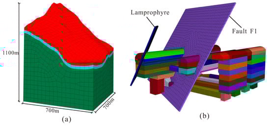 Numerical model for the in situ stress inversion. Mesh model of the surrounding mountain (a) and underground cavern and main geological structures (b).
