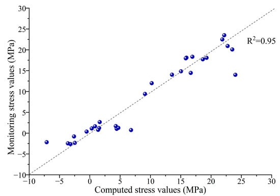 To validate the accuracy of the determined boundary conditions, the obtained coefficients are utilized in the FLAC3D software for additional forward analysis. Table 5 gives the stress results for each measurement point. It shows that the analysis results are generally acceptable for most points, except for the resulted σz of point 5#, where the analysis error is 20.33%. The average analysis error for the remaining points is 8.09%. Compared with Table 3, the measured σx and σy of point 5# are almost equal to those of other points, but the measured σz of point 5# is 7–15 MPa greater than that of other points, so it may not be accurately measured. As a result, the back-analysis σz of point 5# does not match very well with the measured data. Figure 6 compares the inversed and tested stresses. The dashed line indicates where the two stresses are equal. It can be observed that there is excellent agreement between the PSO-BP results and measured data, with a correlation coefficient of about 0.95.