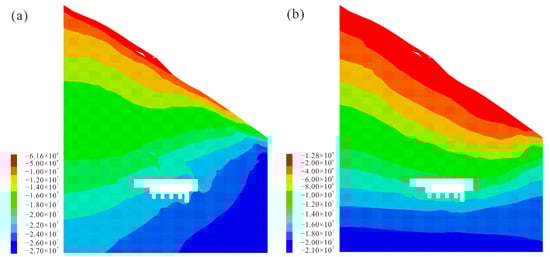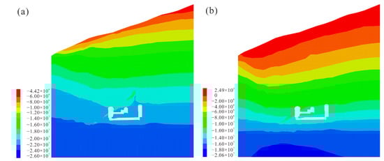 Stress distribution in the cross-section of the main powerhouse. (a) the first principal stress, (b) the third principal stress.