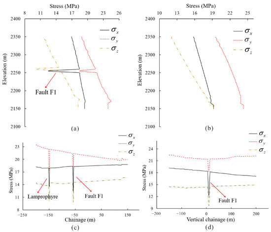 The results of the in situ stress inversion indicate that weak structural planes may have the potential to significantly influence the stress state of an engineering area. As shown in Figure 9, all three stress components increase with the buried depth while remaining relatively consistent within the main powerhouse area at the same elevation. There is a sudden drop in stress values at the fault area, with the σx falling to around 10–12 MPa, σy about 17–20 MPa, and σz about 8–10 MPa. However, the stress state around the tailrace surge chambers does not fluctuate since the fault and the lamprophyre do not intersect with the tailrace surge chambers. Thus, faults and lamprophyre could notably influence the in situ stress distribution, leading to a reduction in the in situ stress value of the surrounding rock.
