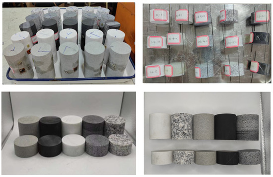 Five rock materials, including fine granite, coarse granite, shale, marble, and sandstone, were selected as experimental research objects. All rocks had good integrity, uniform and dense texture, and no defects visible to the naked eye. The rock specimens were prepared by drilling and cutting. The specimens were divided into three categories. The first was a standard cylindrical specimen with a diameter (D) of 50 mm and a height (H) of 100 mm. The second was a standard Brazilian split specimen with a diameter (D) of 50 mm and a height (H) of 25 mm. The third was the dynamic impact compression specimen with a diameter (D) of 50 mm and a height (H) of 50 mm. Non−parallel end faces and axial deviations were within the allowable limits of the International Society of Rock Mechanics (ISRM) standards. Figure 1 shows the specimens of five kinds of rocks after processing.