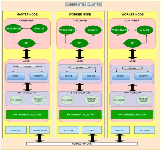 In this section, we discuss the architecture of the proposed solution for detecting and observing the DDoS attack in different Kubernetes nodes. Furthermore, we show how the proposed system can scale horizontally and vertically and be dynamic. Vertically scalable nodes can manage numerous resources simultaneously, whereas horizontally scalable nodes will continue to function as the number of nodes in the network grows. Scaling the nodes horizontally or vertically needs to be done on the cluster of the Kubernetes on which we are operating the proposed solution. We note that the suggested solution detects and observes DDoS attacks either with the help of the eBPF software or without it. Figure 1 illustrates the schematic block diagram of the Proposed Solution. In both cases, minimal human engagement is necessary.
