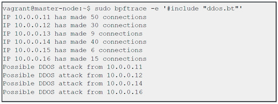 Detecting the DDoS attack on the target machine is also very important. We implemented the detection of the DDoS attack on the containerized-based application, i.e., a web application working along with an Apache server. After the attack is initiated, it is detected by the eBPF program based on a specific threshold and considered as a possible IP source of the attack. Figure 2 shows an example of the detection of the attack on the target node.