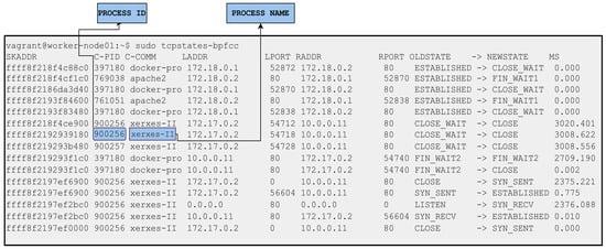 In [12,13], the kernel used eBPF for detection duties like looking for page faults and monitoring the distribution of memory, among other things. The benefit and success element of eBPF was experienced while creating complex networks. Use of eBPF at the kernel, which filtered a sizable number of network packets using a matching rule set of the Snort approach, as the solution for the system’s intrusion detection.