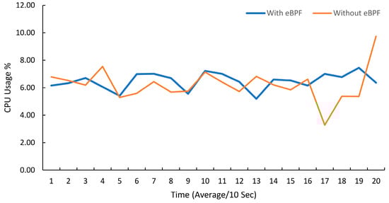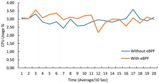 To determine the overhead of CPU utilization, we have used the Linux tool for the recording of the CPU utilization statistics, i.e., system activity report (SAR). In an average of every 10 s, the record was examined. When stats are gathered, either the eBPF application is used or not, as illustrated in Figure 4, to record the information. When using the eBPF programs versus not using them, there is rarely any change in CPU usage. Thus, it was established that the master node’s CPU overhead is not present.