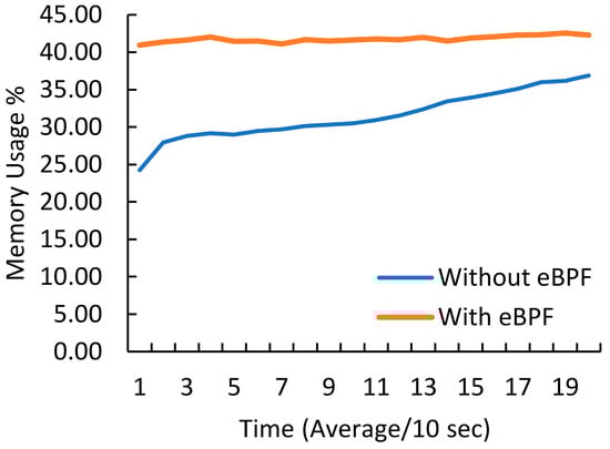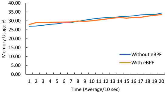 Our proposed solution gathered all the recorded information using the eBPF program and without it. In Figure 7, it is shown that, in the initial stage, there is a huge difference in the execution of the memory with the use of eBPF because of the full utilization of the memory. However, we have also observed that, after a while, the difference between the eBPF program and without it became very small. Therefore, it can be easily concluded that after some time the difference will become near 1–2 and, in some cases, less than 1, so on the worker node we also have a negligible overhead of memory.