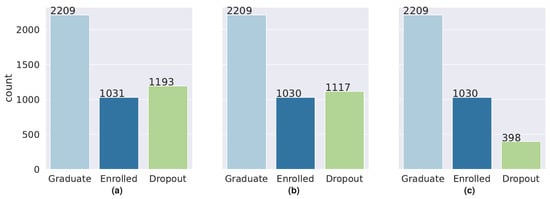 Distribution of the records among the three defined labels and for the datasets built with: (a) information at the time of enrollment (S0); (b) information at the end of first academic semester (S1); (c) information at the end of second academic semester (S2).