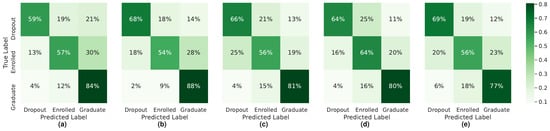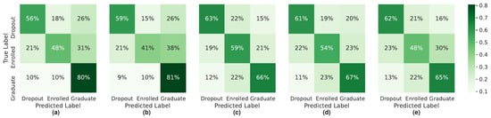The results obtained compare fairly with some other works that attempt to predict students’ dropout or academic performance at early stages, although our performance results are slightly lower. For instance, in a study to predict dropout at early stages [], the authors obtained a model with 72% accuracy at the time of enrollment and 82% by the end of the first semester. A dataset from an engineering school was used. In another study for performance prediction [], the model achieved 79% accuracy for the prediction of students’ performance at the time of admission in a Computer Science degree. Both works used datasets from specific fields of study and binary classification tasks. This is in contrast with our multi-class problem using a heterogeneous dataset, which includes samples from several different fields of study and different schools, and it might explain the slightly lower performance scores of our models.