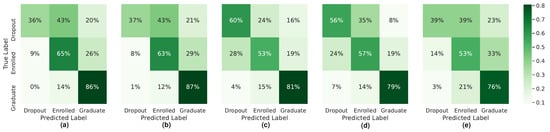 The F1 scores for the class “Graduate”, the most populated one, are consistently higher than scores for the other two classes. The next highest scores correspond to the second most populated class in each dataset: “Dropout” in the case of dataset S1 and “Enrolled” in the case of dataset S2.