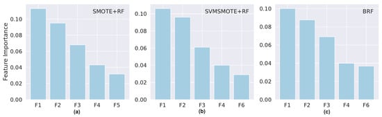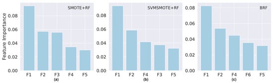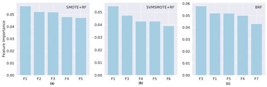 Regarding feature importance, Figure 5, Figure 6, and Figure 7 present the relative weights of the top five most important features for the three models with best scores (SMOTE + RF, SVMSMOTE + RF and BRF) for each dataset, S0, S1, and S2, respectively.