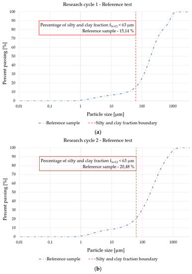 Figure 2. Comparison of graphs of grain size curves for silty sand with silt and clay fractions: (a) fSi+Cl,1 = 15.14% and (b) fSi+Cl,2 = 20.48%. - second type of soil sample—fSi+Cl,2 = 20.48% (the grain size curve in Figure 2b).