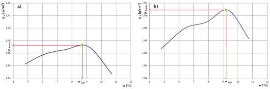 Both types of samples were analyzed in the optimum moisture content test (Proctor apparatus) according to [49]. The value of the optimum moisture content wopt was determined for the obtained maximum volumetric density of the soil skeleton ρd,max, at constant compaction energy and for different moisture contents: