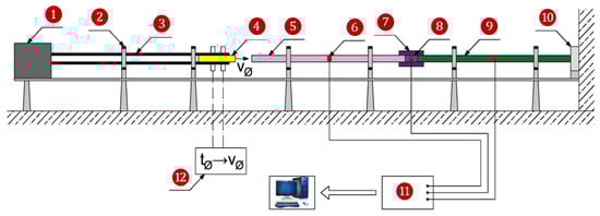 The soil sample ❽ of the SHPB test is cylindrical in shape and is placed in a rigid casing ❼ made of different materials depending on the experimental setup, e.g., Plexiglas, duralumin, or steel. The dimensions and material characteristics of the casing ensure that the uniaxial deformation state of the tested soil occurs when the specimen is pressed from both sides by the initiating ❺ and transmitting ❾ bars. According to the markings in Figure 6 and the methodology for conducting the SHPB experiment, the bar projectile load ❹ is propelled inside the bar projectile guide ❸ by rapidly released air pressure from a pneumatic launcher ❶. The laser timing system ⓫ takes a reading of the time it takes for the bar projectile to move a known distance. Knowing this time allows the impact velocity to be determined. When the bar projectile strikes the initiating bar ❺, a compressive elastic wave is generated in the bar (the incident wave generates deformations in the initiating bar ), propagating along the bar toward the soil sample ❽ surrounded by the casing element (rigid ring) ❼. On reaching the end of the initiating bar, the wave partly continues to propagate (the transmitted wave generates deformations in the transmitting bar ) through the sample towards the transmitting bar and partly is reflected and starts to return to the beginning of the initiating bar (the reflected wave generates deformations in the initiating bar ). The wave that has passed through the sample and reached the transmitting bar at its end is finally attenuated in the damping element ❿. The signals from the set of measuring strain gauges are recorded by a digital recorder and transmitted to a computer ⓬.